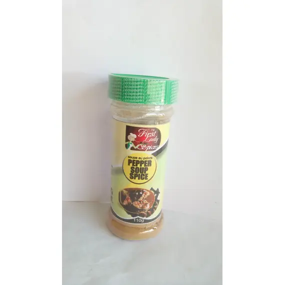 First Lady Pepper Soup Spice is 100% it mixed product content no extra additives. Ashanti pepper, Cloves, Ginger, Calabash, uziza.