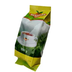 Damarara Tea is a 500g pack of black tea, presented in a vibrant yellow and green pouch, featuring an inviting image of a teacup amidst tea leaves.