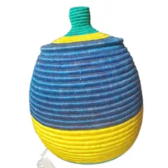 Premium handwoven basket in Rwanda’s national colors (blue, yellow, green), perfect for décor or gifting. Strong, elegant, and symbolic. Priced at 30,000 Frw (≈ $24.00 USD ).
