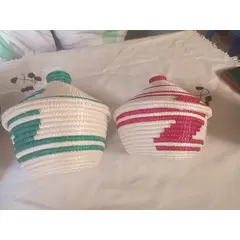 Set of 2 medium-sized handwoven baskets , perfect for storage or serving. Durable, colorful, and affordable at 3,000 Frw per pair (≈ $2.40 USD ). Ideal for everyday use and decoration.