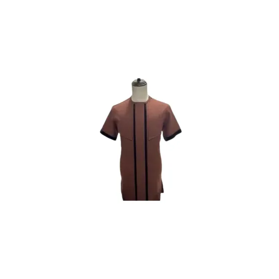 Fashionable short-sleeve men's shirt in a rich brown color with black accents. The shirt features a unique front design with two vertical black stripes running down from the chest to the hem, and angled chest seam details that add structure. Black trimming on the sleeve cuffs provides a sharp contrast, giving the shirt a modern and tailored appearance.Â