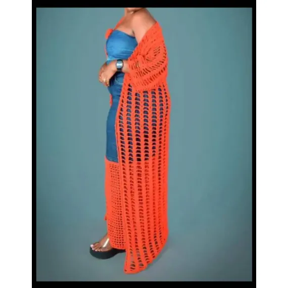 This handmade crochet long kimono adds a stylish touch to any outfit. Designed with an open-weave pattern, it is lightweight, breathable, and perfect for layering over dresses, jeans, or swimwear. Its unique craftsmanship and vibrant look make it ideal for casual outings, beachwear, or evening events.