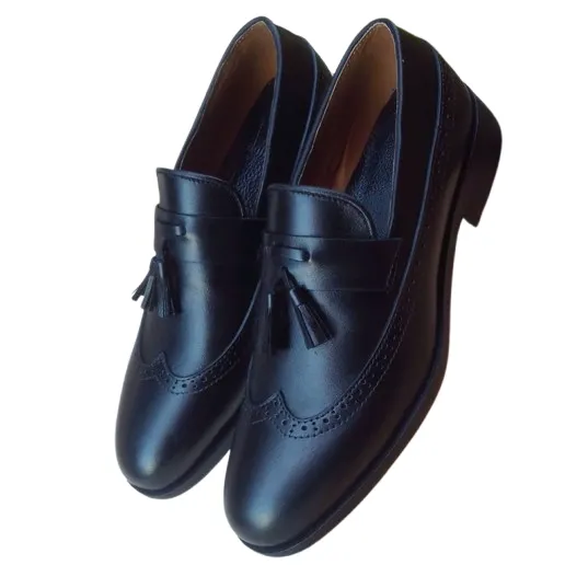 Elegant black leather loafers featuring detailed stitching, a classic brogue pattern, and decorative tassels. Perfect for formal occasions or stylish everyday wear