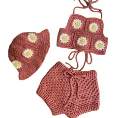 This charming 3-piece knit set, designed for kids aged 5 to 13, combines comfort with playful style. Featuring a soft brown hat adorned with a flower, a matching flower-accented strap top, and cozy knitted shorts, this set is perfect for summer outings and adds a unique touch to any child’s wardrobe.
