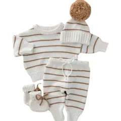 Keep your little one warm and stylish with this 4-piece winter knit set. The cozy outfit includes a striped brown and white beanie, a soft white long-sleeve sweater, matching pants, and warm white gloves—perfect for chilly days. This set is designed to bring comfort and warmth with a trendy touch.