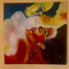 Real Roots is a captivating acrylic painting that explores the complex connection between body, mind, and emotion. Centered around a powerful back turned away from view, the artwork bursts with raw energy as the figure’s head dissolves into streaks of red, melting into a turbulent sky. At the heart of the piece, a bright red form blooms into organic shapes—symbolizing life, resilience, and passion taking root amidst chaos. This emotionally charged piece invites the viewer to reflect on the tension between inner strength and emotional release.