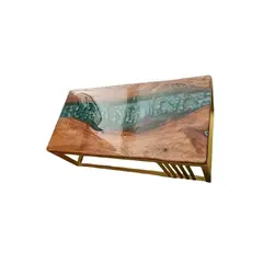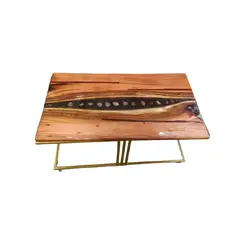 This captivating coffee table blends natural wood's warmth with a striking resin "river" embedded with luminous "stones," all elevated by sleek, golden legs for a touch of modern elegance.