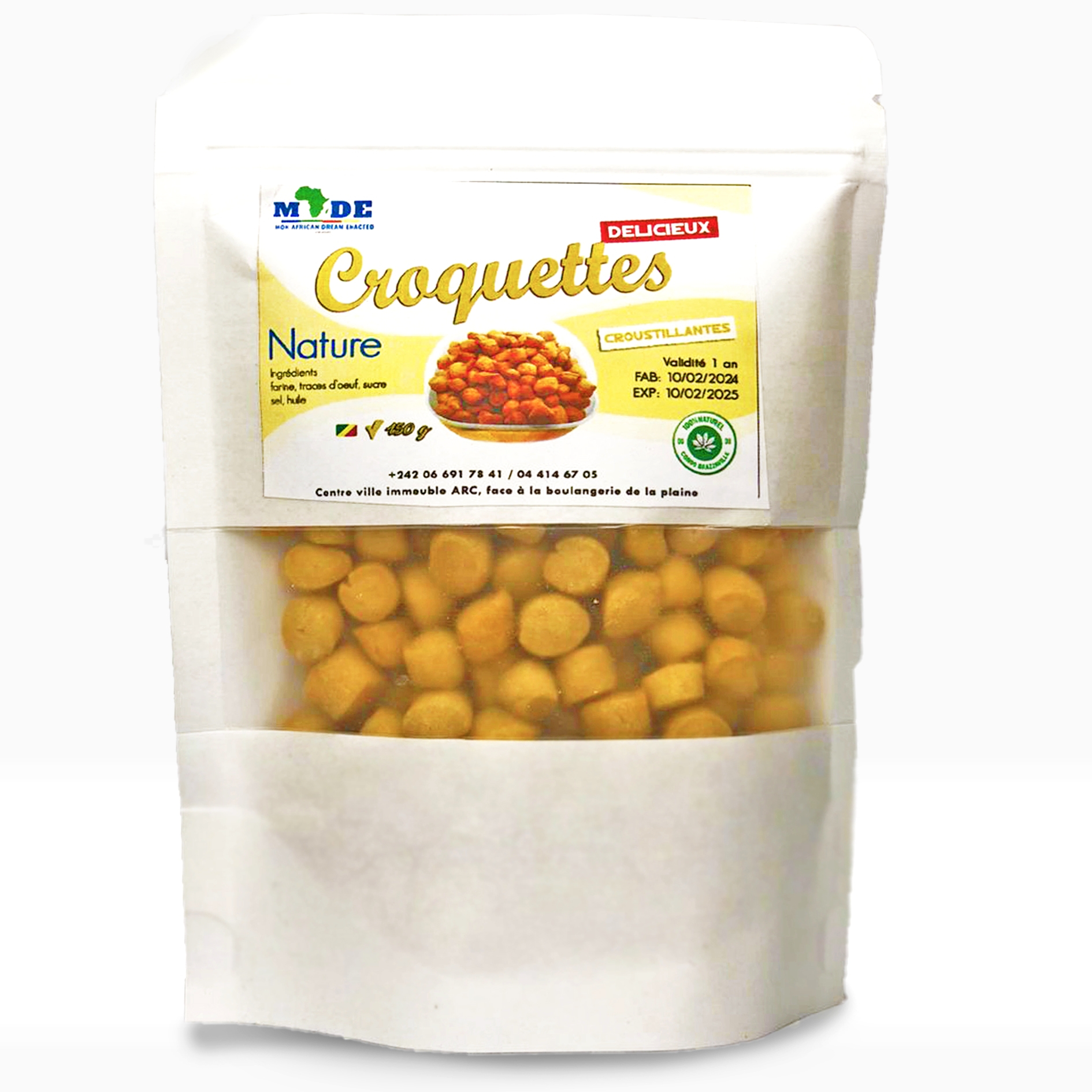Plain Croquettes: Delicious and Crispy Enjoy our natural croquettes, an irresistible treat that combines lightness and crunchiness. Made with flour, traces of egg and sugar, these little wonders are naturally rich in proteins, vitamins and minerals. Light and Tasty: A perfect texture that will delight your taste buds with every bite. Versatile: Ideal for all occasions, they will fit into your daily life, whether as an aperitif, snack or to accompany your dishes.
